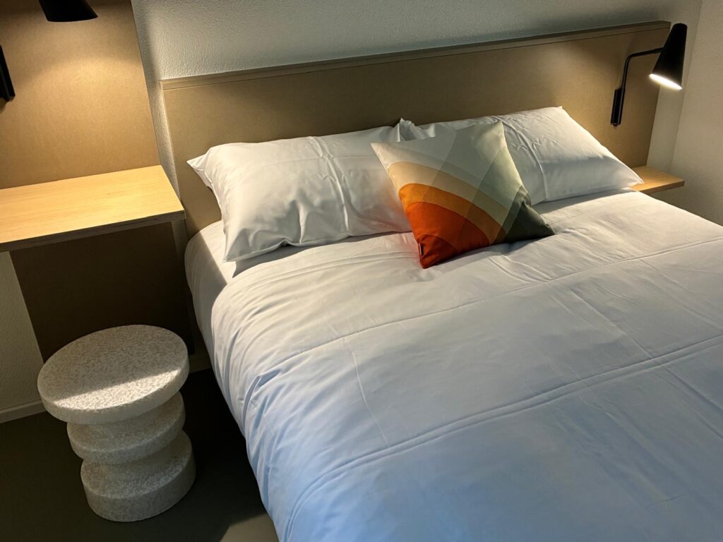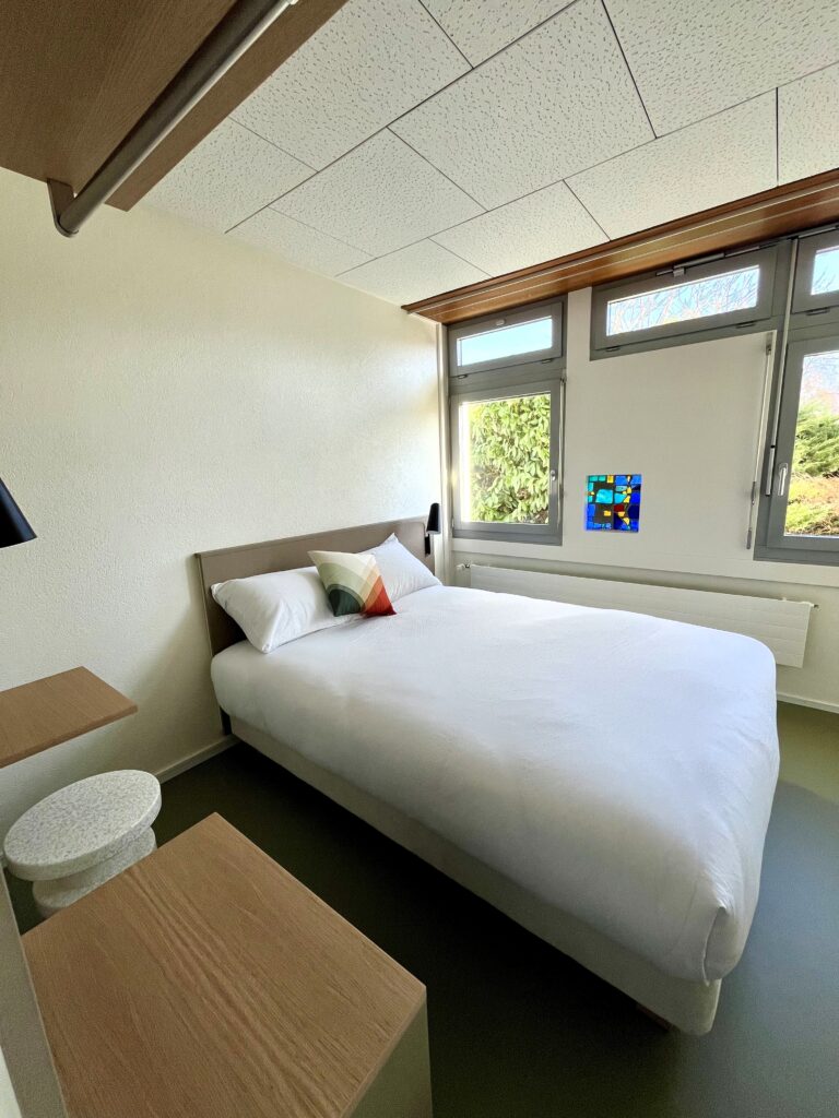 Les chambres de la Maison St-François invitent au calme et à l’essentiel. Dépouillées de superflu, sans télévision, elles laissent place au silence. Chaque pièce abrite un carré de vitrail, il murmure en couleur l’âme du lieu.
